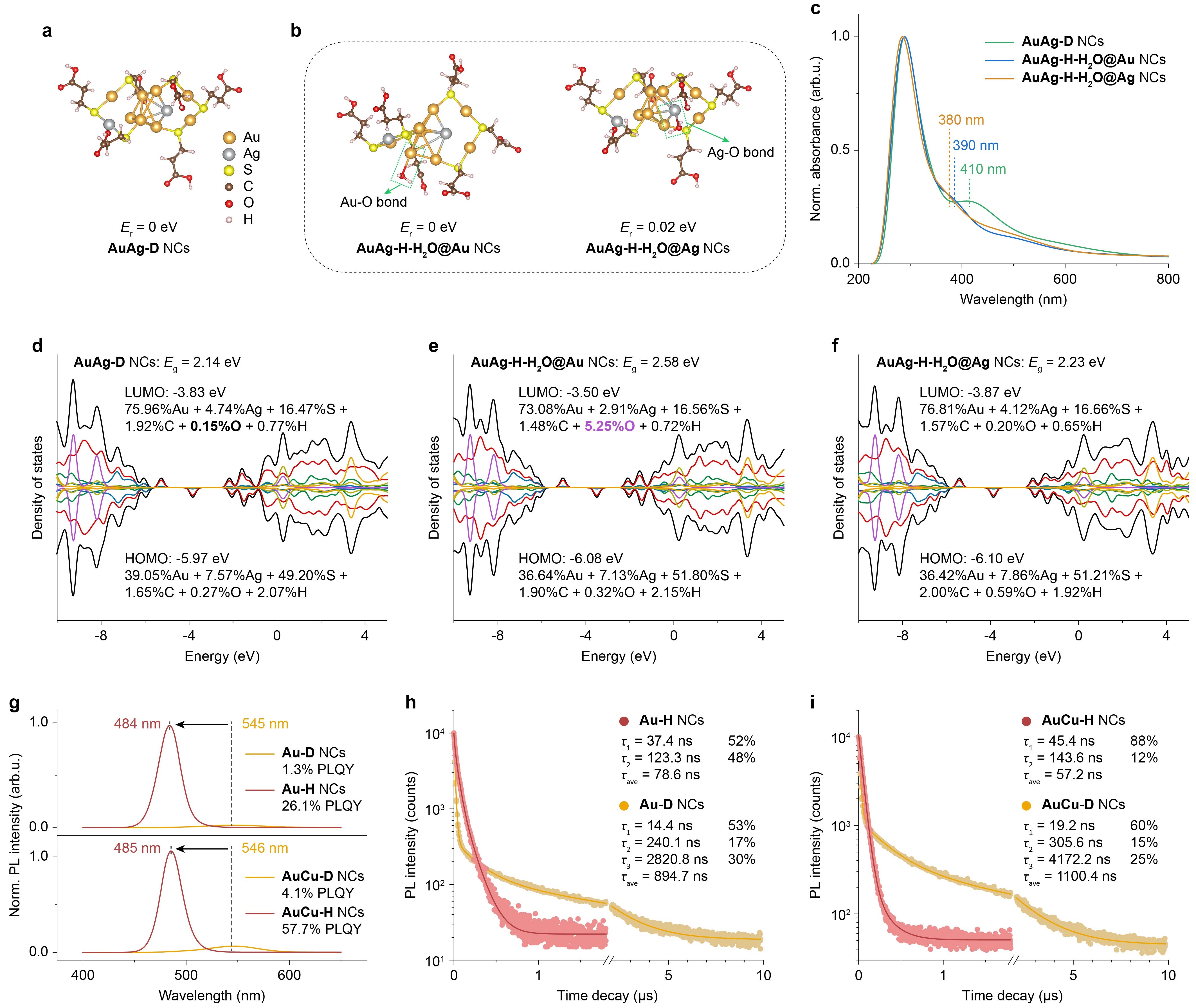 研究人员利用DFT模拟和水分子吸附前后AuAg纳米团簇的模型结构并发现水分子以Au-O和Ag-O键形式结合到内核暴露的Au/Ag原子后形成的结构是相对稳定的。计算得到的吸水后团簇的吸收峰位发生了明显蓝移,与实验结果一致。对吸水前后纳米团簇的电子态密度分析发现水分子结合在内核Au原子后LUMO能级的氧原子的贡献明显增加,证明了水分子能够改变团簇的电子结构并调控发光过程。为了进一步验证水分子点亮金属纳米团簇的普适性,研究人员合成得到了系列Au和AuCu纳米团簇。研究发现Au-D和Au-H的PLQY从1.3%增加到26.1%,而AuCu-D和AuCu-H的PLQY从4.1%增加到57.7%,相应的发射峰均发生明显蓝移。发光寿命和同步辐射光谱分析进一步证明了水分子在Au和AuCu两种纳米团簇体系中的作用机理与其在AuAg纳米团簇中一致。
