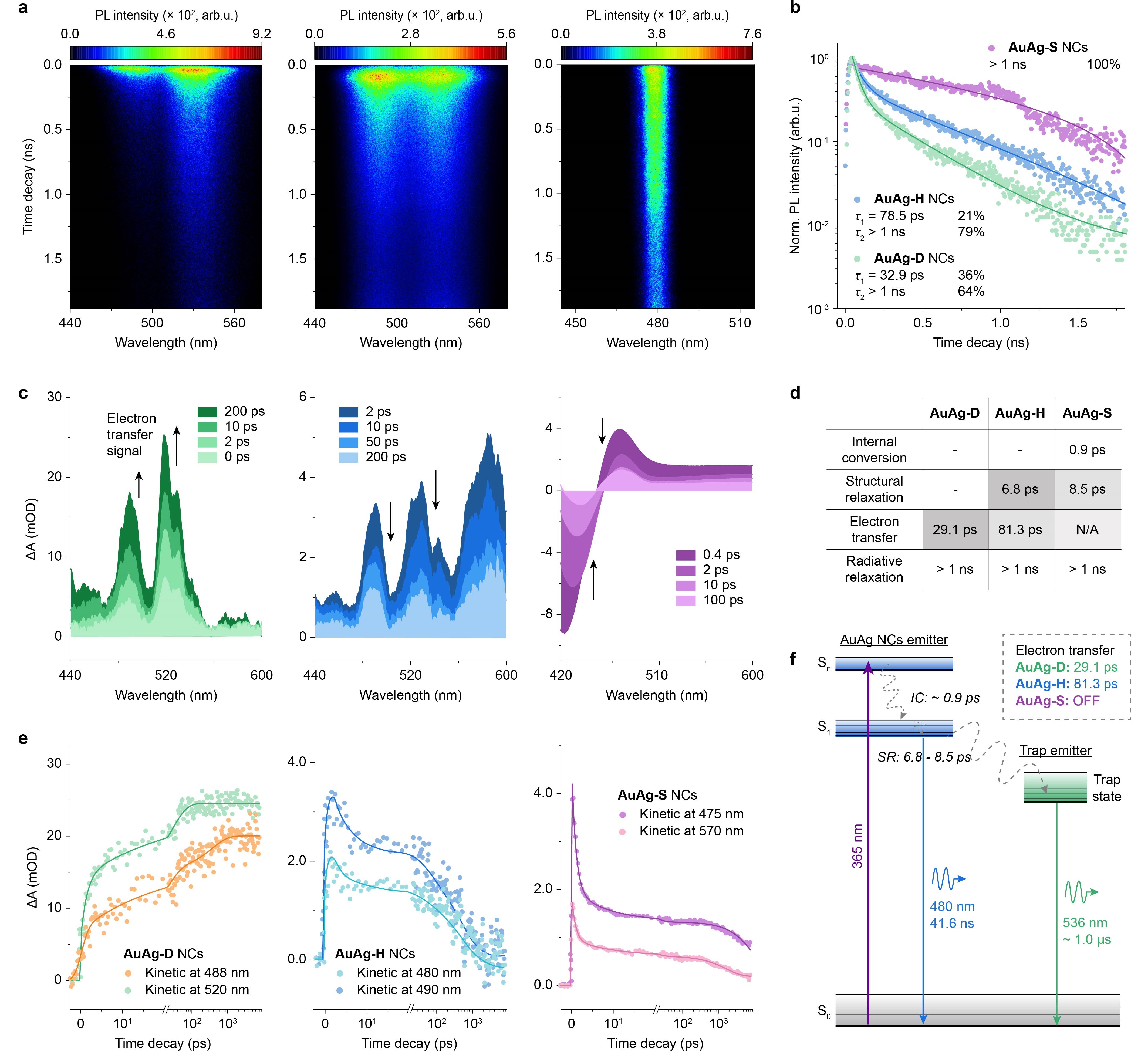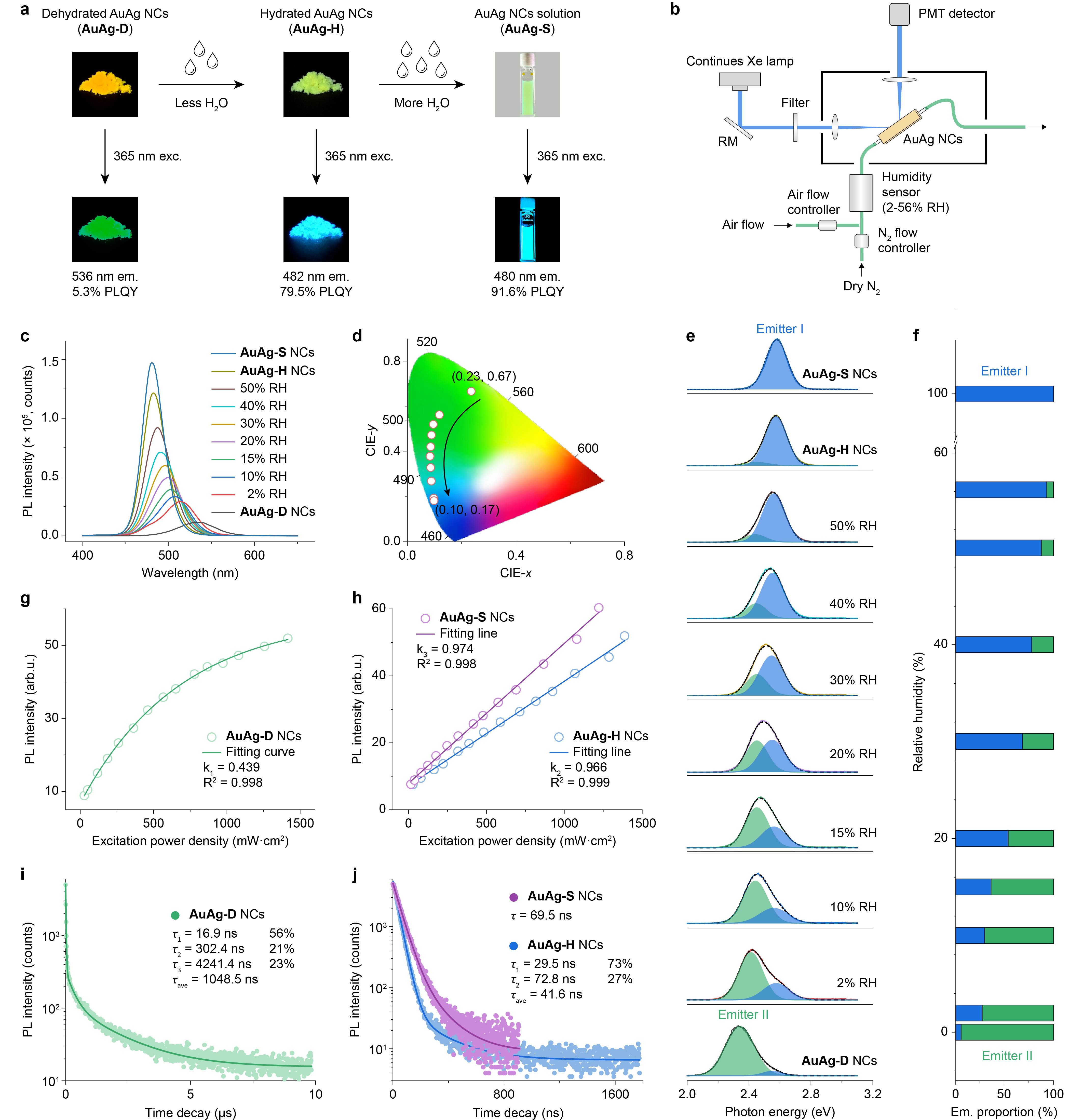 研究人员以3-巯基丙酸(MPA)配体保护的AuAg纳米团簇作为模型团簇。研究发现吸水前AuAg纳米团簇粉末(AuAg-D)表现出536 nm绿光发射。在56%相对湿度环境中充分吸附水分子后,AuAg纳米团簇(AuAg-H)的发射峰逐渐蓝移到482 nm。AuAg纳米团簇的水溶液(AuAg-S)的发射峰进一步蓝移到480 nm。同时发光的CIE色坐标位置从(0.23, 0.67)的绿光范围连续移动到(0.10, 0.17)的天蓝光范围,显现出巨大的发光颜色可调性。在带边能量光的激发下,AuAg-D、AuAg-H和AuAg-S纳米团簇的PLQY分别达到了5.3%, 79.5%和91.6%。研究人员进一步对不同相对湿度环境下AuAg纳米团簇的发射峰进行分峰拟合,最终得到了2.55 eV的高能发射峰(Emitter I)和2.42 eV的低能发射峰(Emitter II)两个发光组分,且发现Emitter I的发光占比随相对湿度的增加而增加,反之Emitter II随之减少。通过变激发功率密度的发射光谱测试,Emitter I和II分别被归属于AuAg纳米团簇中本征态(S1)和缺陷态的发光。三种AuAg纳米团簇的发光寿命测试表明:AuAg-D纳米团簇中除了μs级缺陷态发光组分还检测到了团簇本征态发光的辐射和非辐射过程,暗示了缺陷态发光可能来源于AuAg纳米团簇中本征态向缺陷态的电子转移。从AuAg-D到AuAg-H,发光寿命中缺陷态发光组分消失,证明水分子能够使AuAg纳米团簇中激发态电子的弛豫路径从缺陷能级转变为本征S1能级,使得辐射衰减速率加快了375倍;而从AuAg-H到AuAg-S,发光寿命中团簇非辐射发光组分消失,证明水分子兼具抑制团簇中非辐射跃迁的功能,使得非辐射衰减速率减慢了4倍(图1)。在多次吸/脱湿循环后,AuAg-D和AuAg-H纳米团簇的发光峰位基本保持不变,展现出出色的发光稳定性。