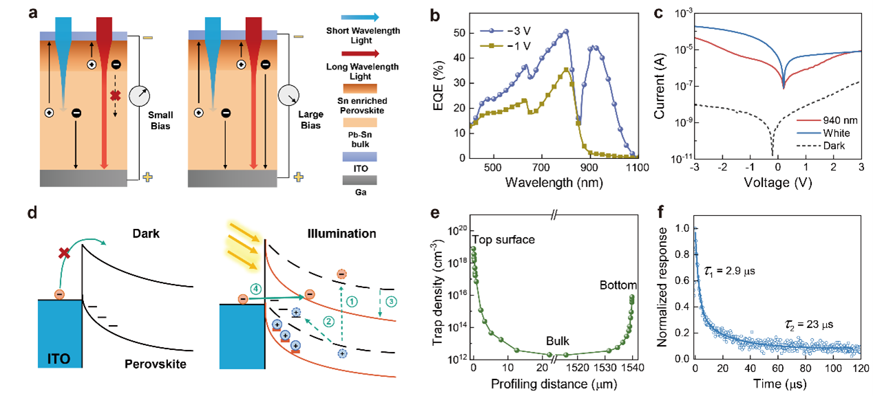 针对无ICR日夜成像对探测器的需求,研究团队通过开发具有垂直金属梯度分布的钙钛矿单晶,设计和研究了可变响应光谱的光电探测器。通过结合材料特性和理论计算,我们证明了氧气暴露对成分梯度的影响,并阐明了锡铅钙钛矿和氧气之间相互作用的具体影响。基于载流子漂移距离随偏压的变化,锡铅钙钛矿光电探测器可以在从可见光到近红外波段范围(接近1100 nm),实现偏置电压调控的光谱响应变换。Pb-Sn合金化的梯度分布带来了高迁移率和内建电场,使钙钛矿光电探测器能够实现46.4 kHz的-3 dB截止频率和177 dB的线性动态范围。此外,富锡表面抑制了未配位降解中心的形成,使得探测器表现出了长达一年的运行稳定性。最后,钙钛矿光电探测器在红外光干扰下,展现出了与具有ICR的商用硅光电探测器相当的颜色还原能力。此外,钙钛矿光电探测器的高灰阶分辨率使其在日夜成像应用中具有广泛的应用潜力。金属合金钙钛矿光电探测器的发展,将为光电成像技术开辟一种有效的设计策略。