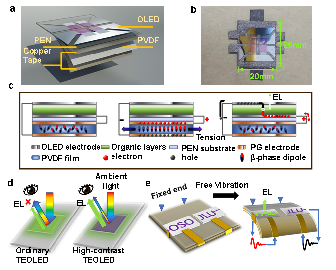 针对以上问题,研究人员提出在PEN衬底上集成高性能顶发射OLED与有机薄膜压电发电机实现柔性有机力刺激响应发光器件的策略,通过优化设计压电发电机的弯曲应力和顶发射有机发光器件的光传输过程,成功解决了器件的辨识度问题。在此基础上,研究人员提出了以生理等效亮度和恰可识别环境光照度(JNAI)为参数的器件性能评价方法,这是对力刺激响应发光器件性能首次进行定量表征。优化后的力刺激响应发光器件能够在手指拨动的低频、小幅度激励下产生明显的脉冲光发射。其生理等效亮度达到11.5 cd/m2,JNAI高达3000 lux,能够在室外阴天或室内开灯的情况下明显辨识。