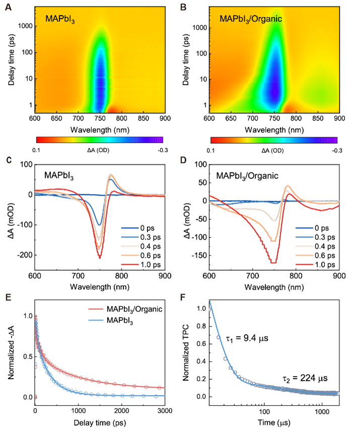图三:超快光电表征。(A和B) MAPbI3器件(A)和MAPbI3/有机器件(B)随时间-波长变化的瞬态吸收谱。(C和D) MAPbI3器件(C)和MAPbI3/有机器件(D)在选定时间尺度下的瞬态吸收光谱。(E) 750 nm处瞬态吸收光谱随延迟时间的变化。(F) ANPD的TPC表征。