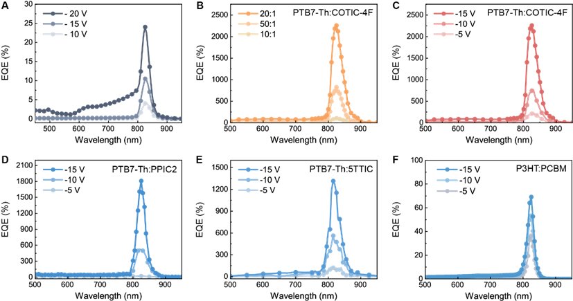 图二:不同窄带光电探测器的响应特性。(A)不同偏置电压下钙钛矿单晶窄带光电探测器的EQE。该器件在-20 V偏压下失去良好的窄带响应。(B)不同有机倍增层掺杂比下ANPDs的EQE。(C)不同电压下掺杂质量比为20:1的探测器的EQE。(D至F)利用PTB7-Th:PPIC2 (D)、PTB7-Th:5TTIC (E)和P3HT:PCBM (F)构建了不同的ANPD
