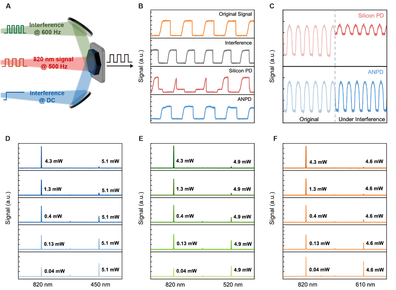 图五:ANPD的抗干扰性能表征。(A)测量系统设置示意图。(B)干涉光对硅光电探测器和ANPD的信号波形的影响。(C)干涉光对硅光电探测器和ANPD的信号幅度的影响。(D~F)抑制450nm (D)、520 nm (E)和610 nm (F)干扰光的性能。