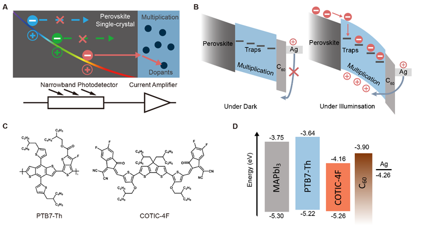 图一:倍增窄带光电探测器(ANPD)的原理图。(A) ANPD结构示意图及窄带探测机制。(B)有机倍增层的工作机理。(C) PTB7-Th和COTIC-4F的分子结构。(D)钙钛矿和有机材料的能级结构。