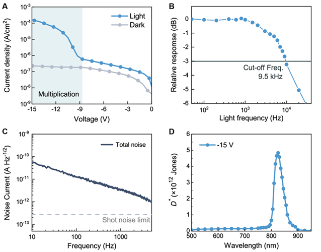 图四:探测器的关键性能。(A) 器件的暗电流和光电流。(B)相对响应随光频率的变化。(C)实测的总噪声电流。(D)-15 V下的比探测率。