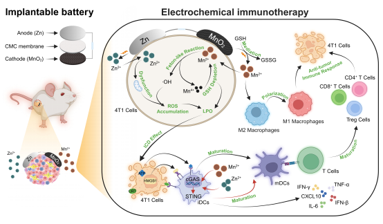 日前,公司卢革宇教授团队在《科学进展》(Science Advances)上发表题为“Tumor microenvironment-activated Zn//MnO2 battery for sustained and local electrochemical immunotherapy”的研究论文。该工作提出了植入式锌-锰电池的免疫激活方案,通过电化学反应设计,持续、原位递送免疫激动剂,解决了传统离子递送平台的全身毒性和频繁注射问题。
