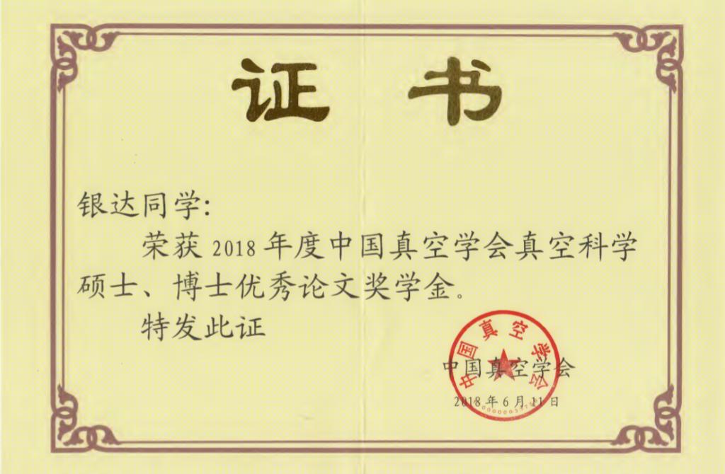 恭喜公司博士毕业生银达在2018年度中国真空学会优秀博士论文评选中荣获优秀博士论文奖学金。