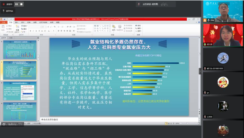 结合会议内容,孙瑜老师表示就业中心已经启动了“春季云上招聘月”“就业空中直播间”等系列活动,公司也开展了“E职相伴”主题系列活动,在复杂的就业形势下公司和公司永远是同学们的坚实后盾。本次活动为有同学们分析了2022届毕业生就业形势,为同学们毕业就业的规划给出了详细的指导与建议,同时对公司开展就业指导工作提供了思路。