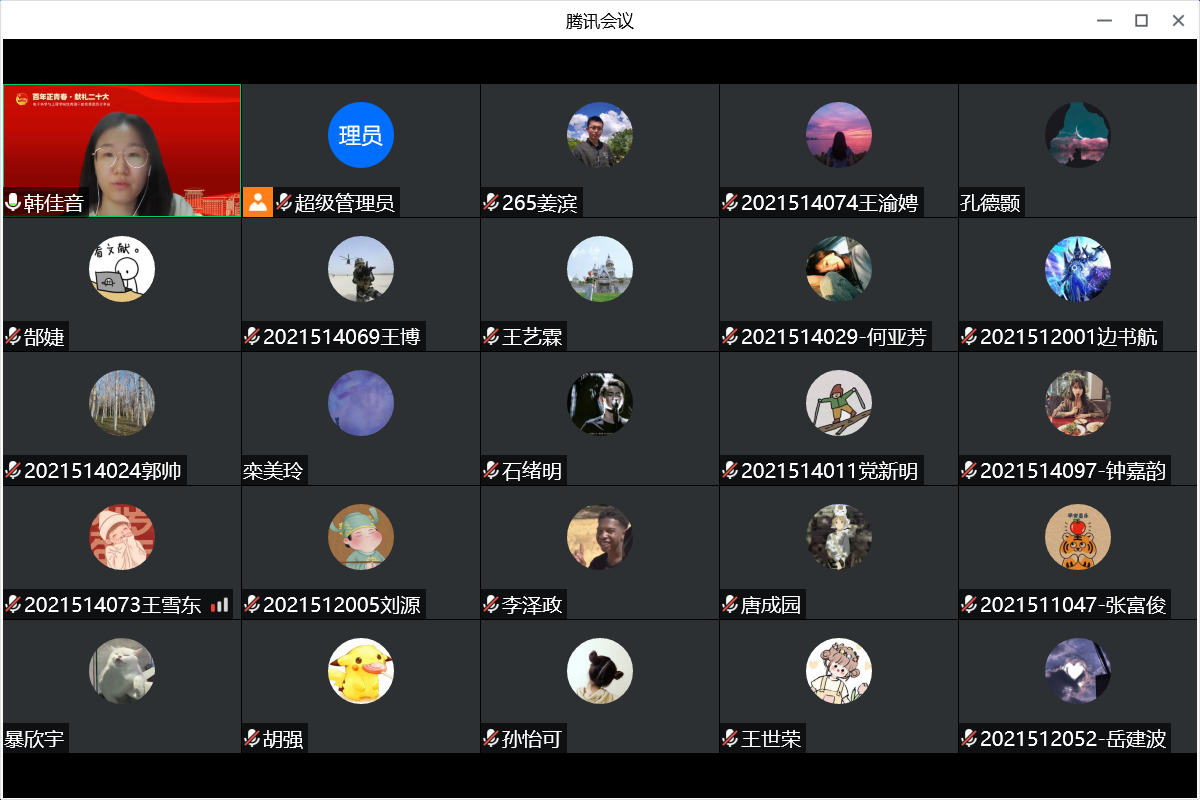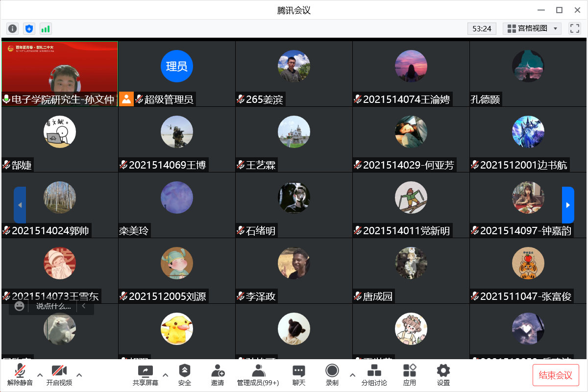 会上,研究生团干部、团员代表顺次发言,结合自身学习、生活、工作的经历分享了经验与感悟。2019级博士李臻赜、2020级博士李为佳和2021级博士蒋理分别作为博士三个团支部代表讲述了学术研究过程中攻坚克难的不懈奋斗,体现新时代青年人自强不息的创新精神,给予师弟师妹们鼓励与信心,要“志不求易、事不避难”;2019级硕士杨丽萍、周朝歌、陈泓宇,2020级硕士孙文仲、王琳、韩佳音、周正,2021级硕士马雪南、刘伟、岳建波分别作为硕士十个团支部的代表,带领同学们重温共青团的发展历程,感受五四运动的热血与青春,分享疫情封控期间志愿服务过程中的感悟与体会,彰显青年人勇挑重担的使命与担当。