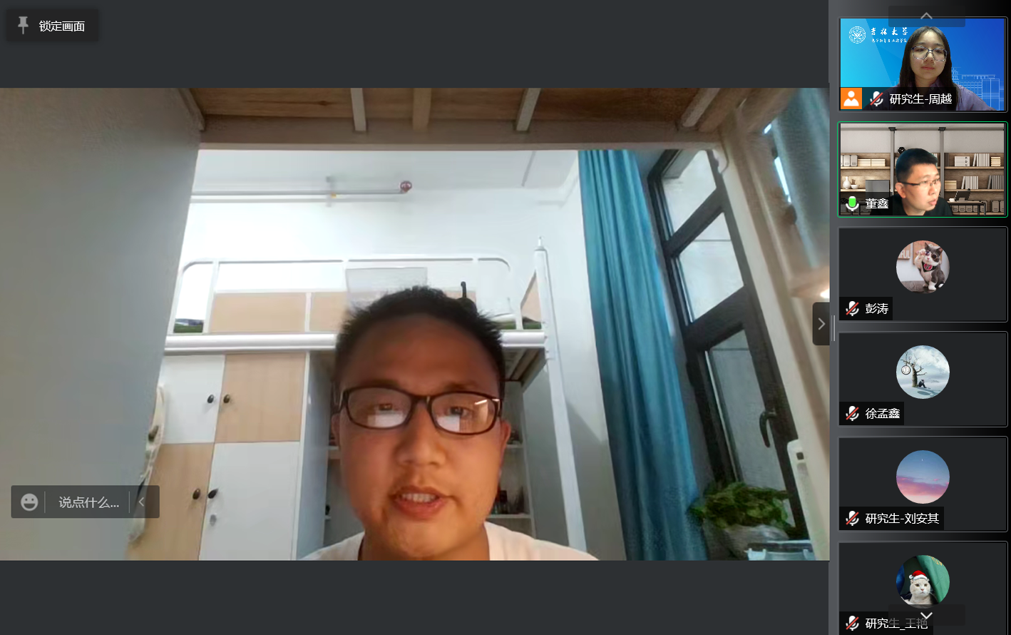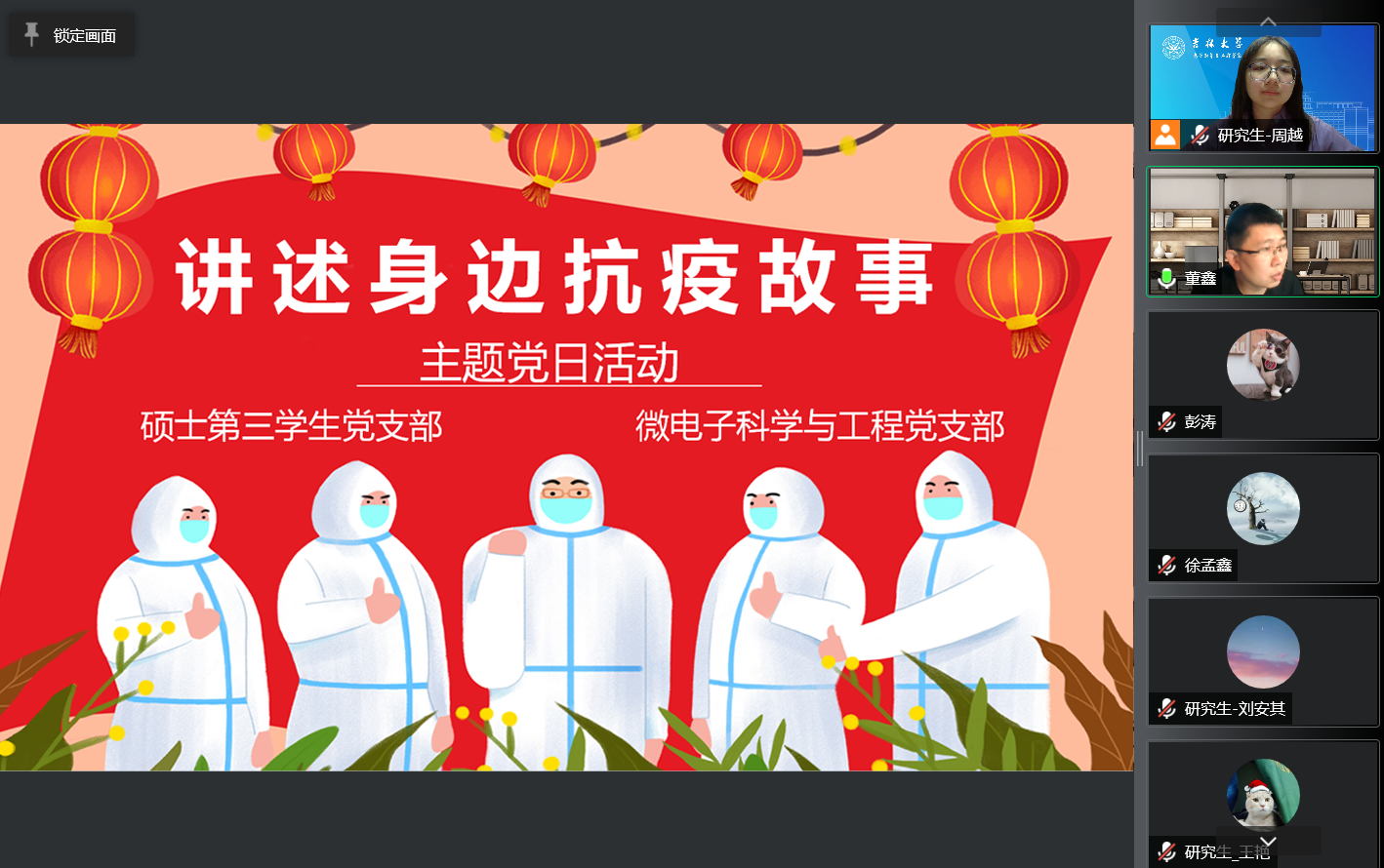 在本次抗击疫情中,支部中涌现出许许多多无私奉献,冲在“前线”的优秀志愿者同志,他们身处各个岗位默默守护着安全的校园,保障着同学们的需求。首先,由员工支部的志愿者代表李凡和彭涛同学依次分享了他们在志愿活动中的抗疫故事和心得体会。经过分享全体党员感悟到了吉大电子人在抗疫战役中的磅礴力量,每一位同学都勇敢地肩负起时代赋予青年的历史责任与使命担当。随后,教工党支部书记董鑫老师为同学们分享了他在社区参与抗击疫情的故事,虽然未身处校园,但仍然奉献着自己的力量,同时又为同学们的下一步科研工作给出了宝贵的意见并提出了美好的希冀。
