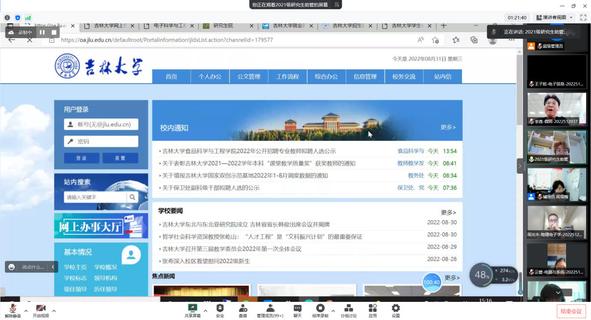 为了使同学们尽快了解公司情况,融入学习生活,公司于2022年8月31日14:00举办了研究生新生入学教育大会。本次讲座采取线上形式进行。会议由研究生办公室主任闻雪梅主讲,研究生办公室刘晓云、矫鸥、德育助管以及2022级全体研究生和博士生参加会议。