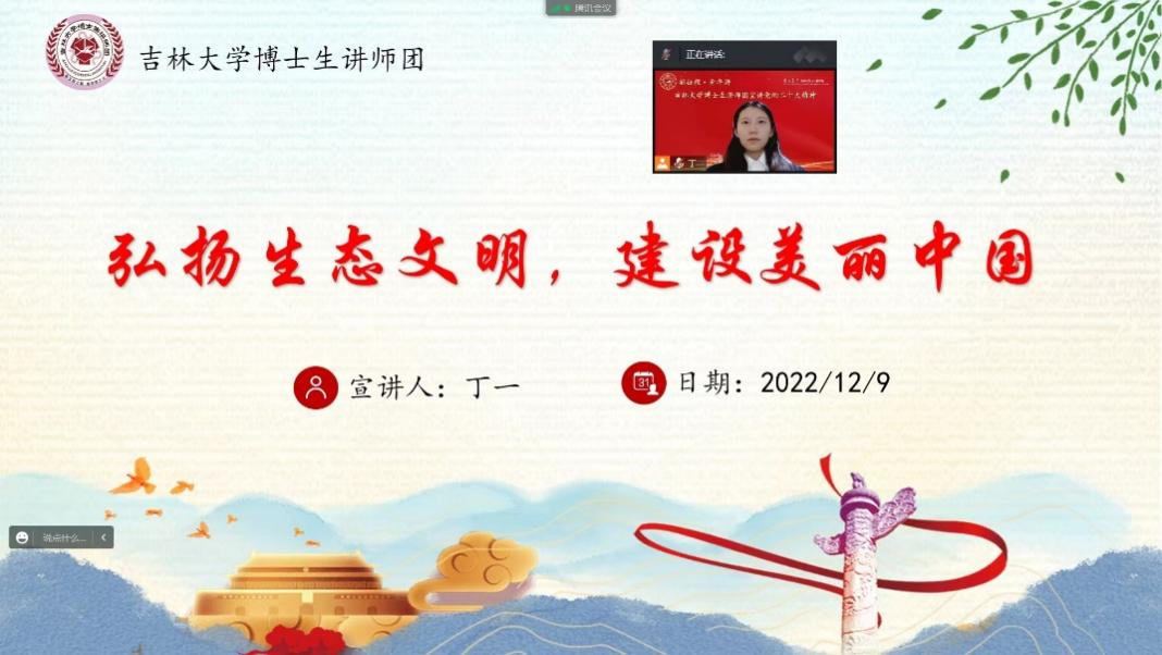 为深入学习宣传贯彻党的第二十次全国代表大会精神,进一步提升党员同志思想政治素质,加强思想政治引领,强化理想信念教育,党委研究生工作部、EMC易倍、EMC易倍官网博士生讲师团联合组织,于2022年12月9日18:00共同开展以“弘扬生态文明,建设美丽中国”为主题的党的二十大精神学习系列活动。本次活动主讲人为EMC易倍官网博士生讲师团讲师、EMC易倍官网博士生讲师团培训部副部长、哲学社会公司马克思主义哲学专业博士研究生丁一。参会人员为电子公司硕士、博士党支部的中共党员、预备党员以及部分入党积极分子、入党申请人。