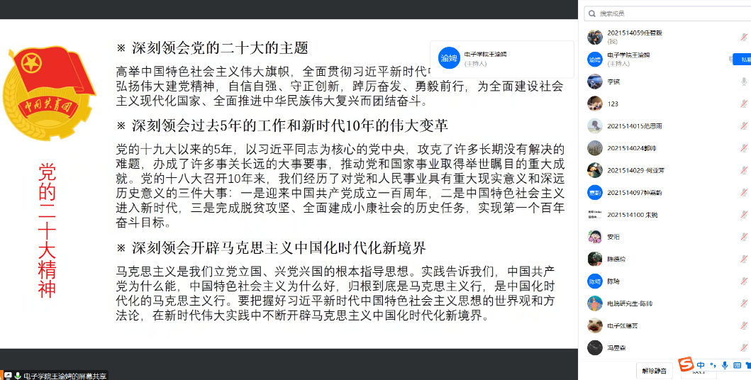 5月4日-6日,2021级电子信息、2022级电子信息、2022级微固物电团支部均线上开展了学习分享会,会上各支部书记带领全体团员深入学习了党的二十大精神相关内容以及习近平总书记在5月3日给中国农业大学科技小院的同学们的回信。在学习过程中,同学们认真学习主动思考,随后结合个人的科研学习实际进行了交流分享,同学们表示一定不负总书记的殷切期盼,将个人奋斗融入时代发展。最后,全体团员面向团旗,庄严宣誓,慷慨激昂的入团誓词激励着每一位同学勇担重任。