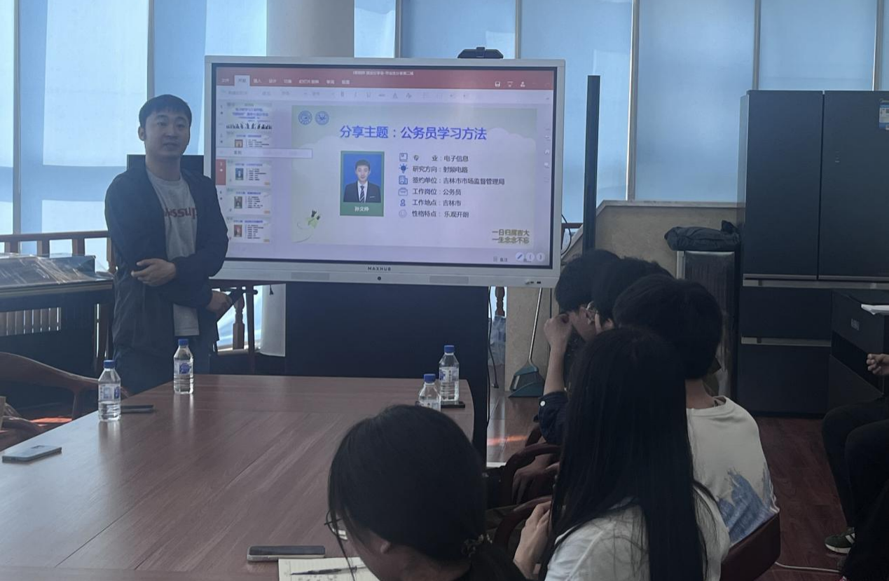 首先,任哲毅同学以“我的求职经历”为主题,讲述了自身从企业面试时期的困惑到逐渐适应工作的心路历程,他强调了在职场中不断学习和提升自我的重要性,鼓励同学们在校期间多实践,积累实战经验,以更好地适应未来的职场环境。紧接着,孙文仲同学和霍星文同学分别以“公务员学习方法”“选调经验分享”为主题,详细介绍了公务员考试的备考方法、心得,结合自身经验,提供了具体的备考策略,包括如何制定复习计划、选择合适的复习资料、应对考试压力等,耐心解答了同学们提出的问题,并提供了许多实用性建议。最后,国家睿同学以“适合的才是最好的”为主题,分享了自身为求职所作的准备以及实用性职场技巧。他特别提到,在面对职场挑战和压力时,保持积极的心态和良好的沟通能力是非常重要的,鼓励同学们在工作中不断提升自己,勇于面对各种挑战。同学们在轻松愉快的氛围中认真聆听了嘉宾们的分享,并积极参与讨论,场面热烈而富有互动性。同学们纷纷表示,这样的交流活动对他们的职业规划和未来发展有很大帮助。
