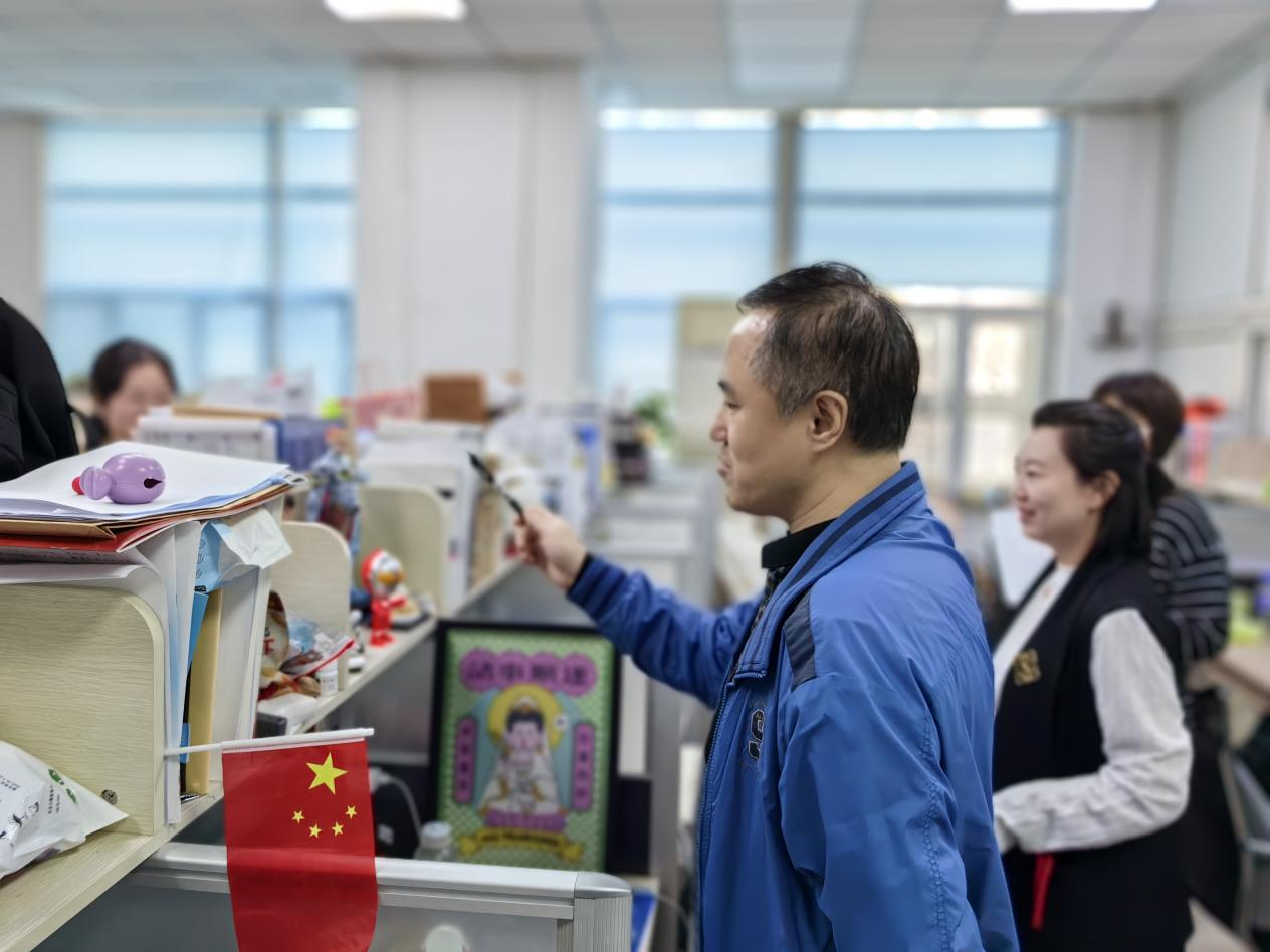 检查小组深入各研究生工作室排查潜在的安全隐患,着重检查了研究生室的电器设备、卫生状况,详细询问了各研究生室的安全管理制度执行情况。在电器设备方面,检查老师提醒师生要注意用电安全,及时关闭不必要的电源,避免使用老化的电线和插座,防止火灾事故的发生。同时,要求各研究生室定期对电器设备进行检查和维护,确保其安全可靠运行。针对检查过程中发现的问题,检查小组当场予以指出,同学们也积极响应,立查立改。