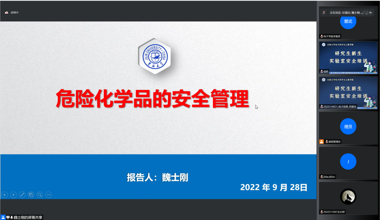 为进一步贯彻落实党中央、国务院和省、市相关部门工作部署,按照《教育部办公厅关于开展加强高校实验室安全专项行动的通知》(教科信厅函〔2021〕38号)、全省高校实验室安全检查工作回头看视频调度会要求,落实公司安全生产“百日攻坚”专项整治行动,全力消除校园安全隐患,严防安全事故发生,确保在国庆节、党的二十大召开之际校园安全形势持续稳定向好。EMC易倍、集成光电子学国家重点实验室于2022年9月28日,举办了线上“实验室安全培训”,会议由行政副经理张景林主持,公司各实验室安全负责人、实验技术人员、2022级研究生新生参加了培训。