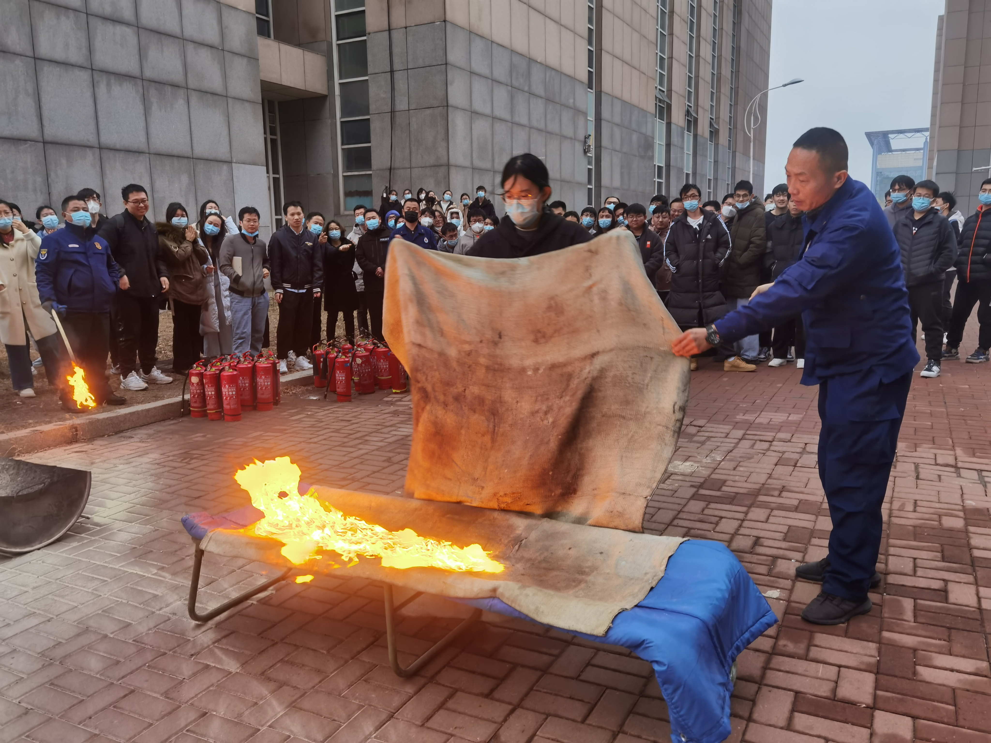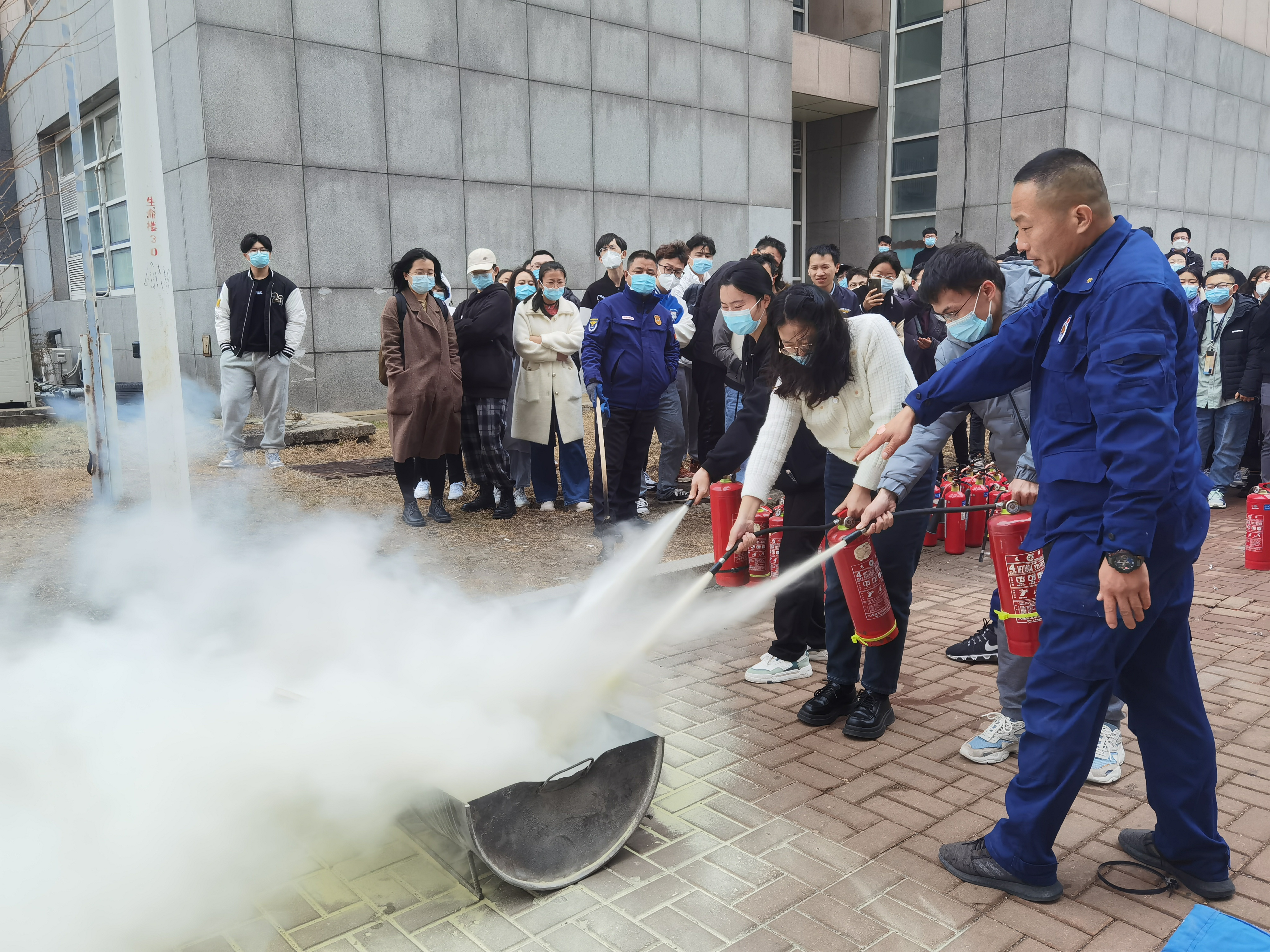 培训结束后,公司组织了消防应急疏散和扑灭初起火灾演练活动。全体师生在引导员的带领下,弯着腰、捂着口鼻快速有序地从指定楼梯和安全出口逃生,撤离到楼外安全地带。然后,保卫处同志详细讲解了实验室常见灭火器材的正确使用方法,并指导师生亲手操作灭火器和灭火毯进行了扑灭初起火灾的演练。整个活动紧张有序,达到了预期效果,取得了圆满成功。