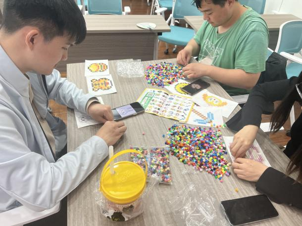 活动伊始,主持人通过轻松有趣的“报数分组”方式,将参与者随机分为2个小组,打破年级与实验室的界限,鼓励同学们在团队协作中相互熟悉。每组同学迅速融入角色,在领取积木材料和卡通像素画后,围绕参考图纸展开自由创作。拼接过程中,组员们积极探讨设计思路,分享拼搭技巧,D314教室内洋溢着热烈的交流声。为营造沉浸式体验,主持人同步播放网页精选的轻音乐与自然白噪音交织,通过1—2小时的沉浸式拼搭,帮助同学们舒缓压力、聚焦创作。活动后微信群内持续分享作品照片与创作心得。